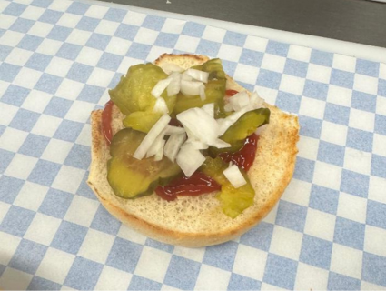 At the restaurant the works includes mayo, tomatoes, lettuce, onions, pickles, banana peppers, jalapeños.