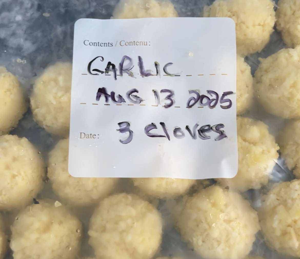 5. Store the frozen garlic balls in a labeled zip-loc bag in the freezer for up to several months.