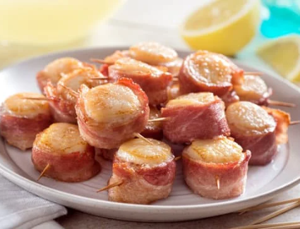Cook back part way. Remove from pan. Wrap bacon around each scallop, secure with wooden toothpick. Place wrapped scallops in baking dish. Combine all ingredients and pour over scallops. Cover and refrigerate at least 4 hours.