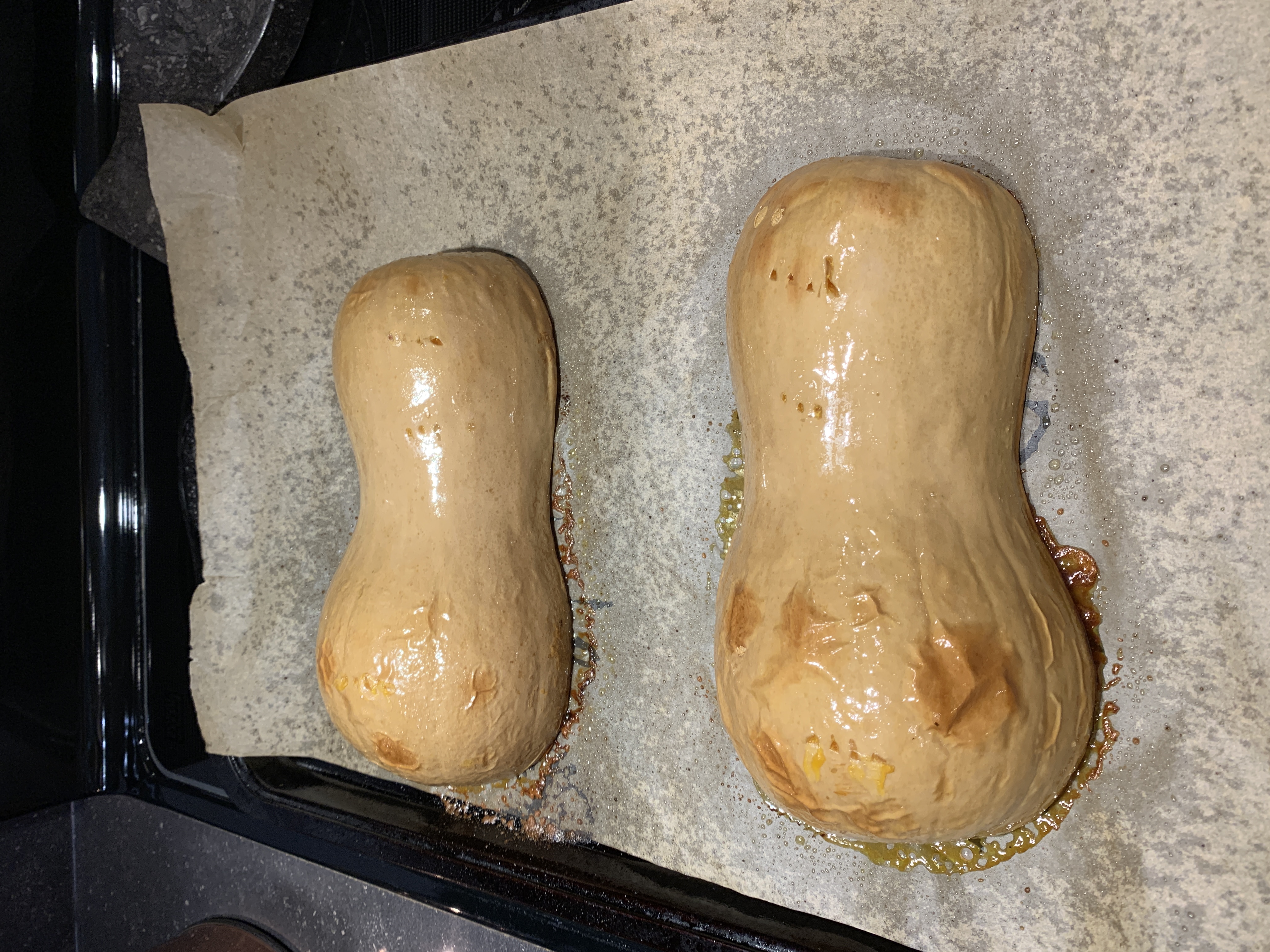 4. Turn the squash halves over and place cut side down on baking sheet.