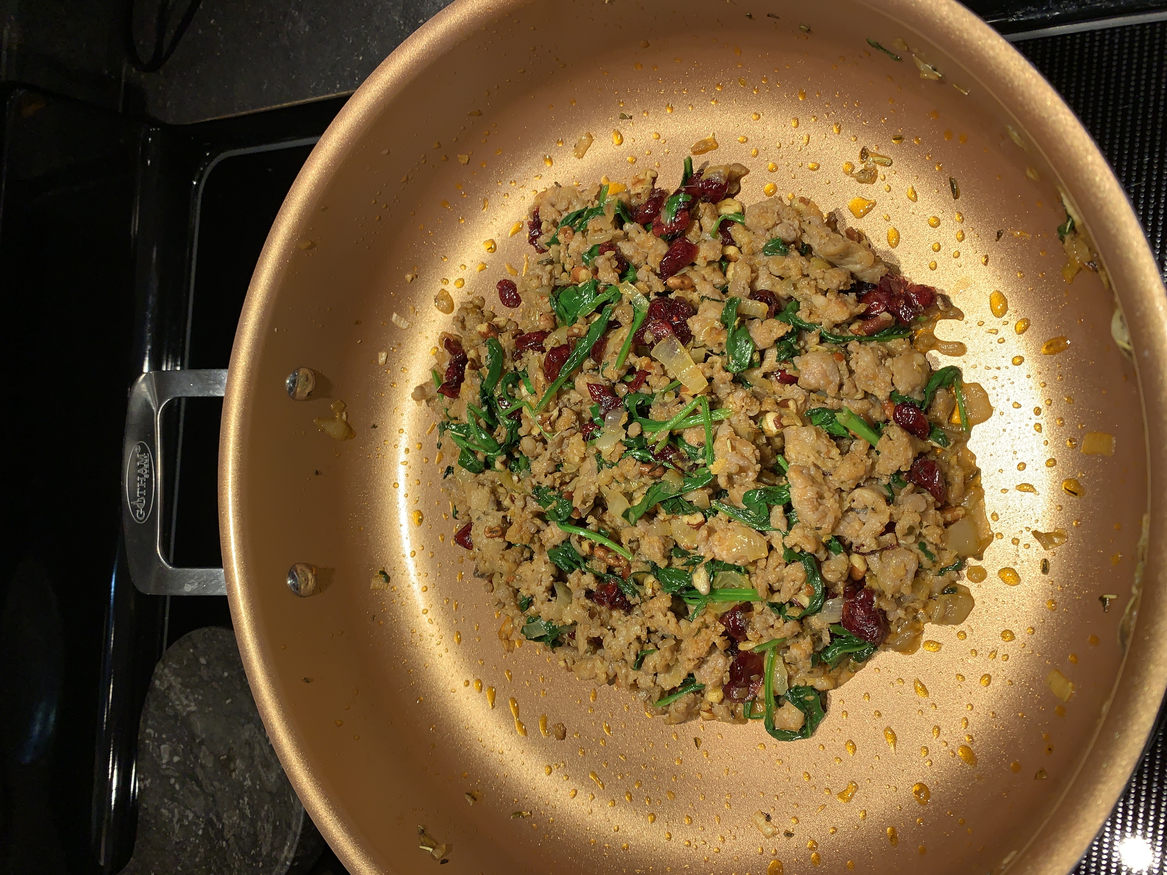 4. Add fresh spinach and chopped pecans and cook another 5 minutes on medium heat until spinach is all wilted.