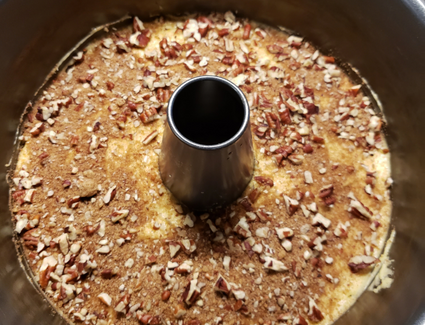 Pour half of the batter into a coffee cake pan and sprinkle half of the nut mixture evenly over the batter. Spread the other half of the batter evenly over the first layer and sprinkle the other half of the nut mixture over top of the cake.